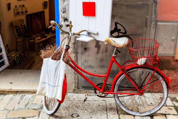 Old Red Bicycle at the Shop Door in Rovinj, Croatia