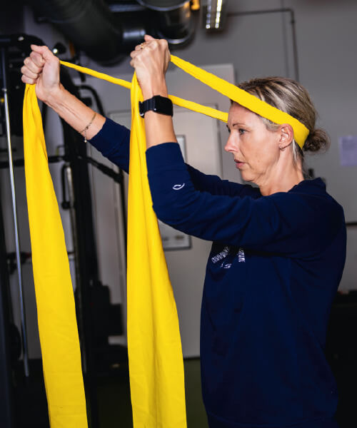 Elastikken bag om hovedet. Hold hovedet helt i ro, mens du strækker og bøjer armene.